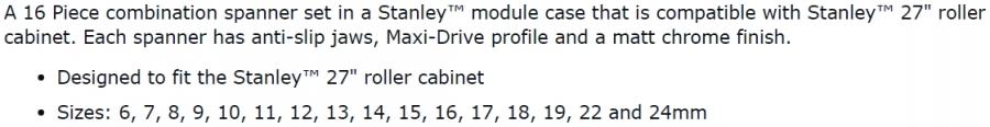 | 1556733 סט מפתחות רינג / פתוח מקצועי - 16 יחידות - STANLEY STMT1-74178 | STANLEY | סט מפתחות רינג / פתוח מקצועי - 16 יחידות - STANLEY STMT1-74178 ♦ מסדרת STANLEY TRANSMODULE SYSTEM ... ארגזי כלים ופתרונות אחסון » פתרונות אחסון ושינוע לרכיבים וכלי עבודה | כמות | |