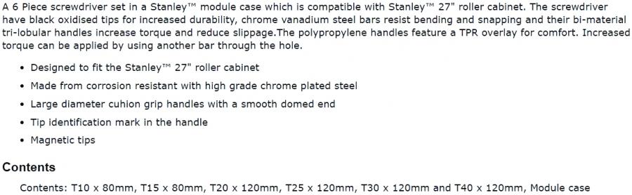 | 4556733 סט מברגי כוכב מקצועי - 6 יחידות - STANLEY STMT1-74182 | STANLEY | סט מברגי כוכב מקצועי - 6 יחידות - STANLEY STMT1-74182 ♦ מסדרת STANLEY TRANSMODULE SYSTEM ... ארגזי כלים ופתרונות אחסון » פתרונות אחסון ושינוע לרכיבים וכלי עבודה | כמות | |