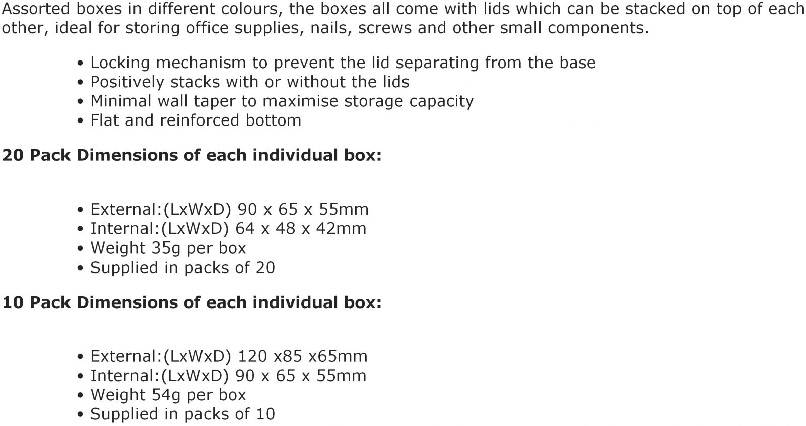 | 9076042 סט 20 קופסאות אחסון צבעוניות 55X65X90MM | REALLY USEFUL PRODUCTS | סט 20 קופסאות אחסון צבעוניות 55X65X90MM ♦ גוף מפוליפרופילן קשיח♦ נעילה כפולה למכסה על י... ארגזי כלים ופתרונות אחסון » פתרונות אחסון - REALLY USEFUL PRODUCTS | לא ניתן להזמין - אזל המלאי | |
