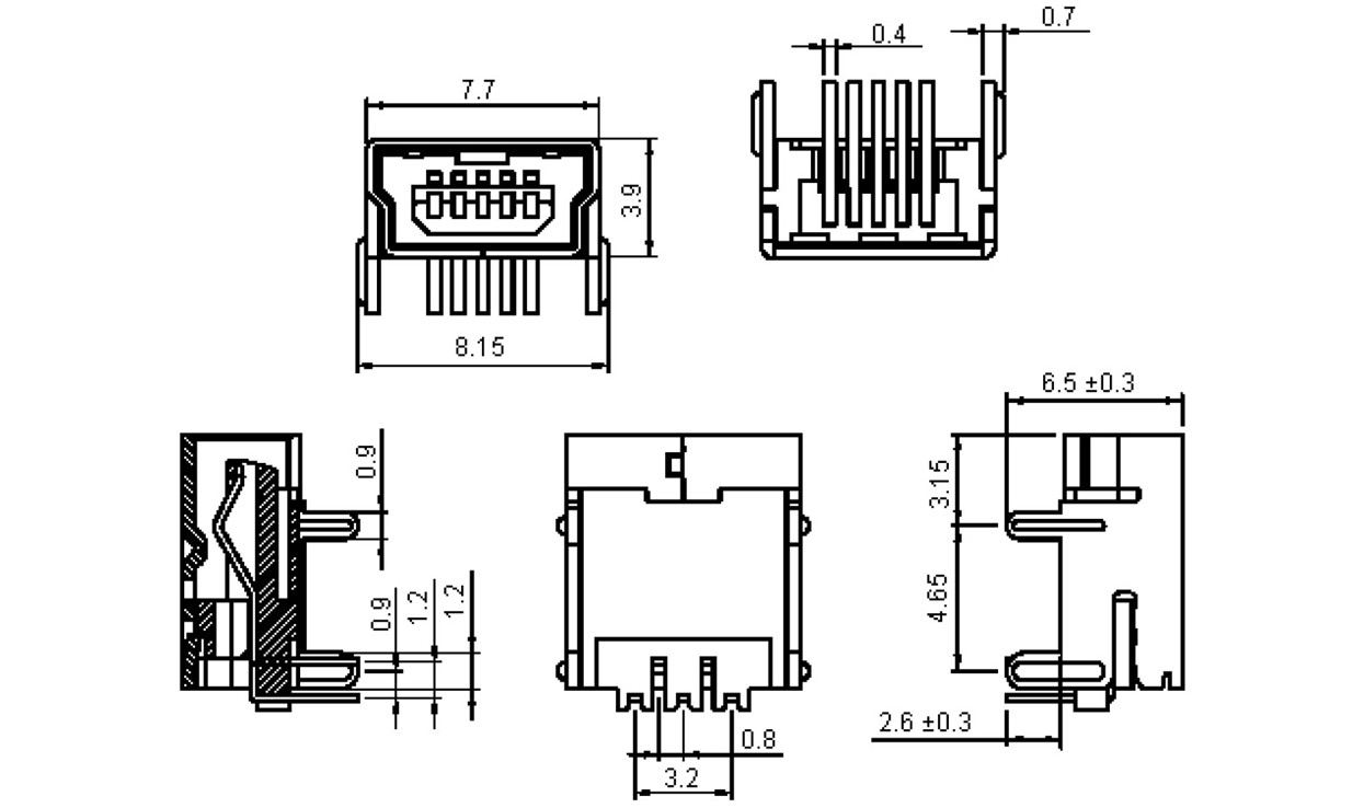 שקע (USB2.0 (MINI B זוויתי למעגל מודפס