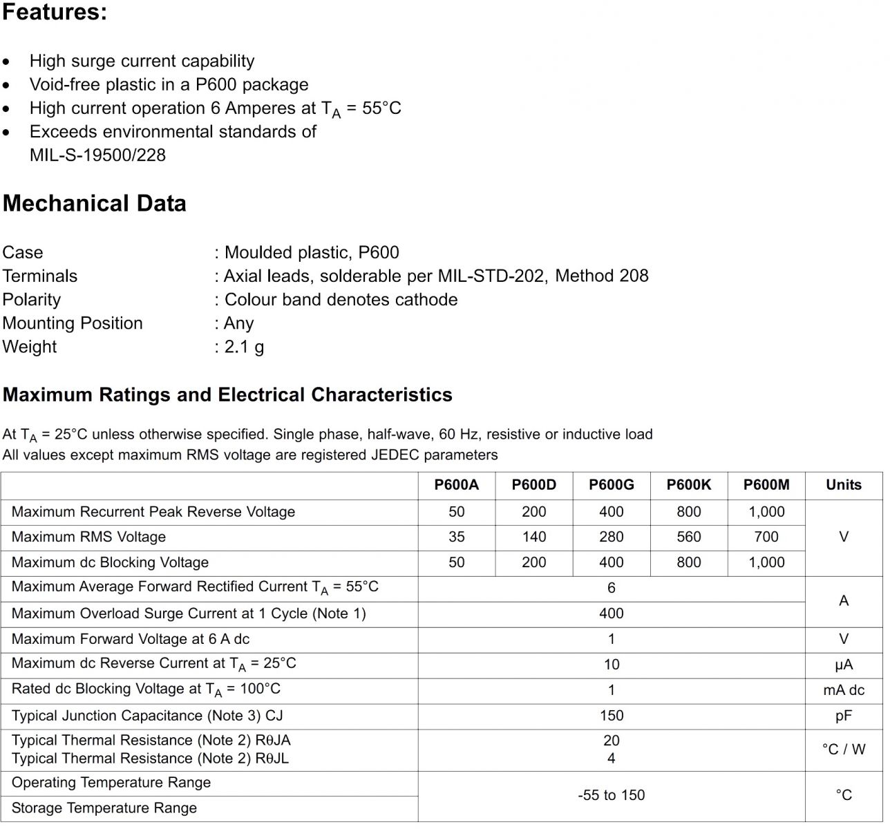 דיודה - 50V 6A - STANDARD RECOVERY ♦ דגם הדיודה : P600A♦ מבנה הדיודה : P600...