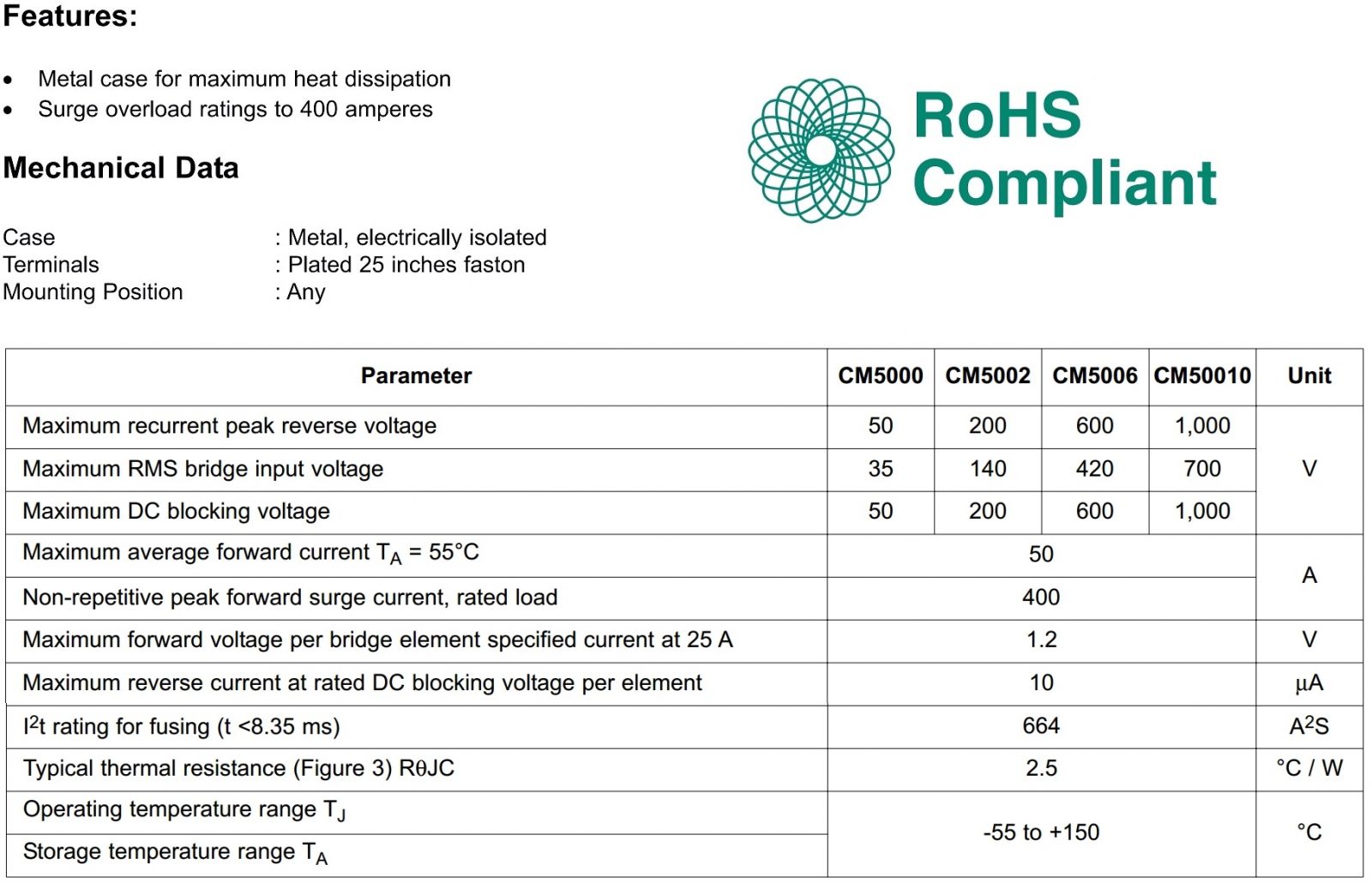 | 4880839 גשר דיודה - 1000V 50A | MULTICOMP | גשר דיודה - 1000V 50A ♦ דגם הדיודה : CM50010♦ מבנה הדיודה : KBPC ... רכיבי אלקטרוניקה » דיודות / גשרי דיודות | כמות |