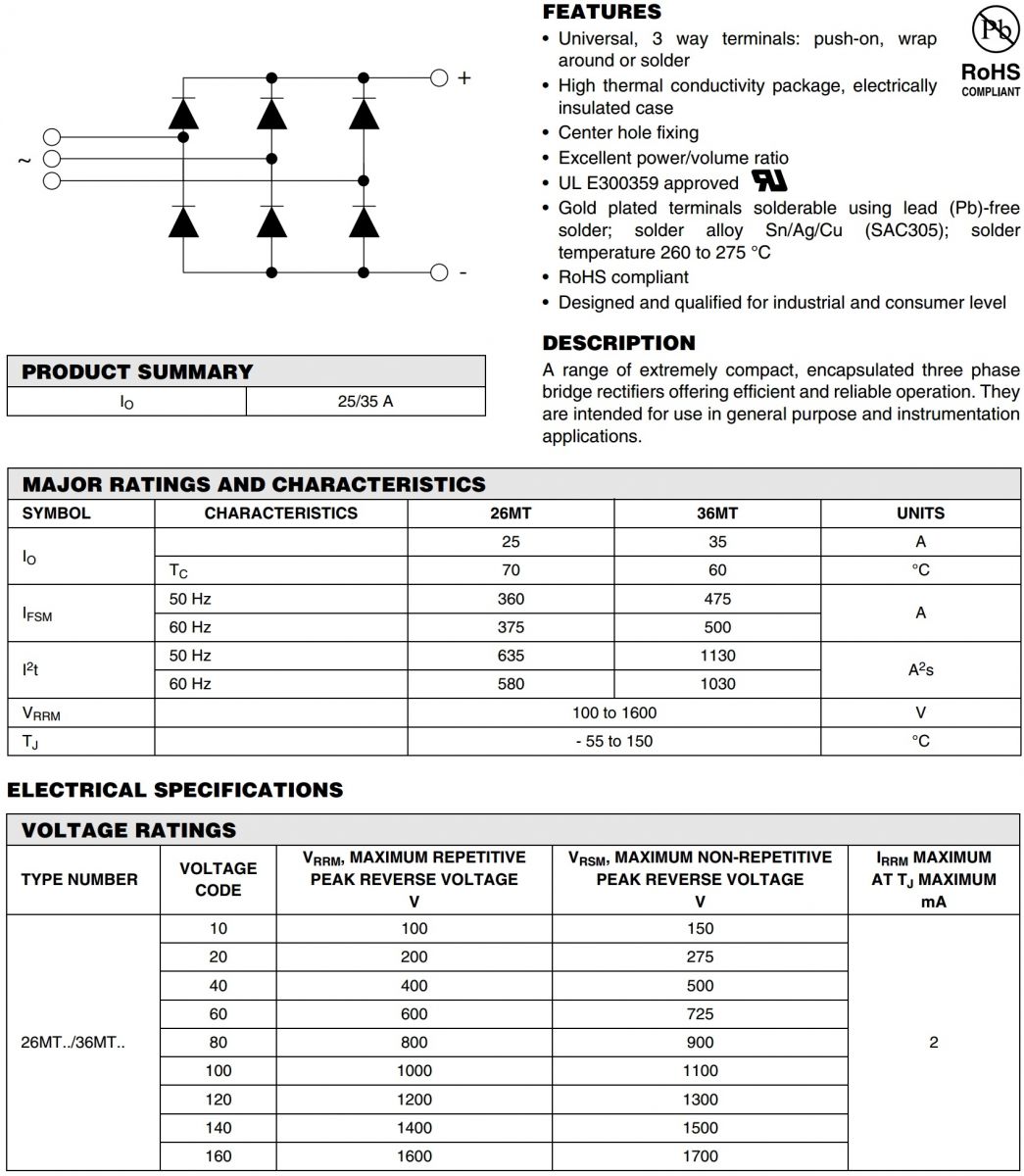 VISHAY 25A / 35A THREE PHASE BRIDGE RECTIFIERS - 26MT / 36MT SERIES