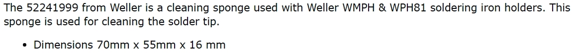 | 636008 ספוג לניקוי ראש מלחם - WELLER | WELLER | ספוג לניקוי ראש מלחם - WELLER ♦ מידות : 70X55X16MM... מלחמים ותחנות הלחמה » ציוד עזר להלחמה | כמות |
