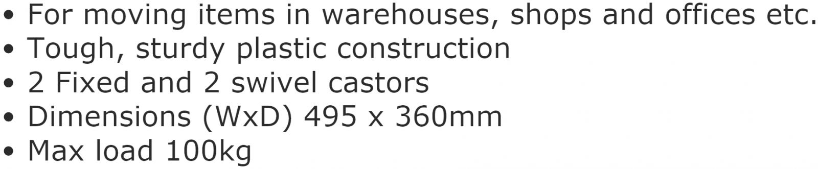 | 3844442 עגלת פלטפורמה ללא ידית - עד 100KG | DURATOOL | עגלת פלטפורמה ללא ידית - עד 100KG ♦ מבנה פלסטיק קשיח♦ שני גלגלים מסתובבים ושני... ארגזי כלים ופתרונות אחסון » פתרונות אחסון ושינוע לרכיבים וכלי עבודה | כמות |