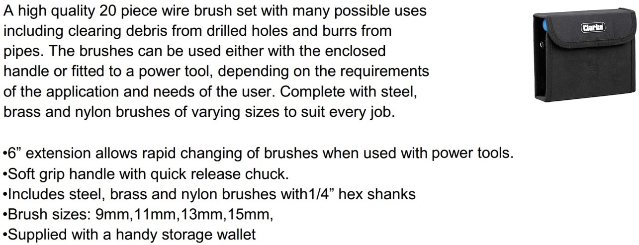 | 4854442 סט מברשות תיל - 20 יחידות | CLARKE | סט מברשות תיל - 20 יחידות ♦ מתאים לשימוש ידני או לחיבור למקדחה / מברגה הסט כולל : ... כלי עבודה ידניים » שונות - כלי עבודה ידניים | כמות | |