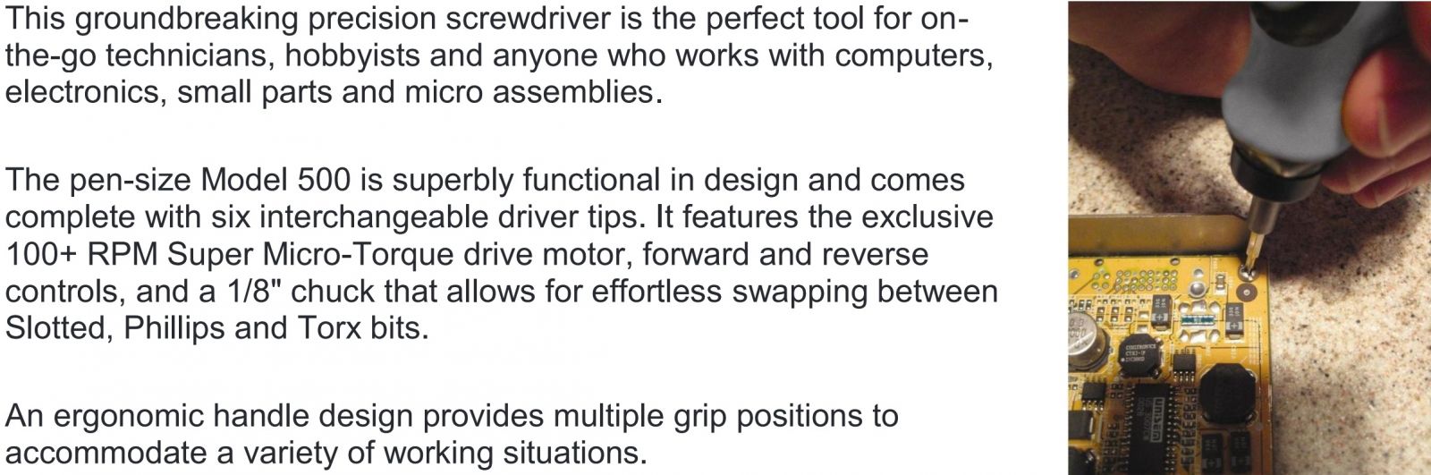 | 6095312 מיקרו מברגה לאלקטרוניקה עם סט ביטים - GT500 | GENERAL TOOLS | מיקרו מברגה לאלקטרוניקה עם סט ביטים - GT500 ♦ ידית ארגונומית עם אפשרויות אחיזה שונות&diam... כלי עבודה נטענים / חשמליים » מברגות / מקדחות / פטישונים | כמות |