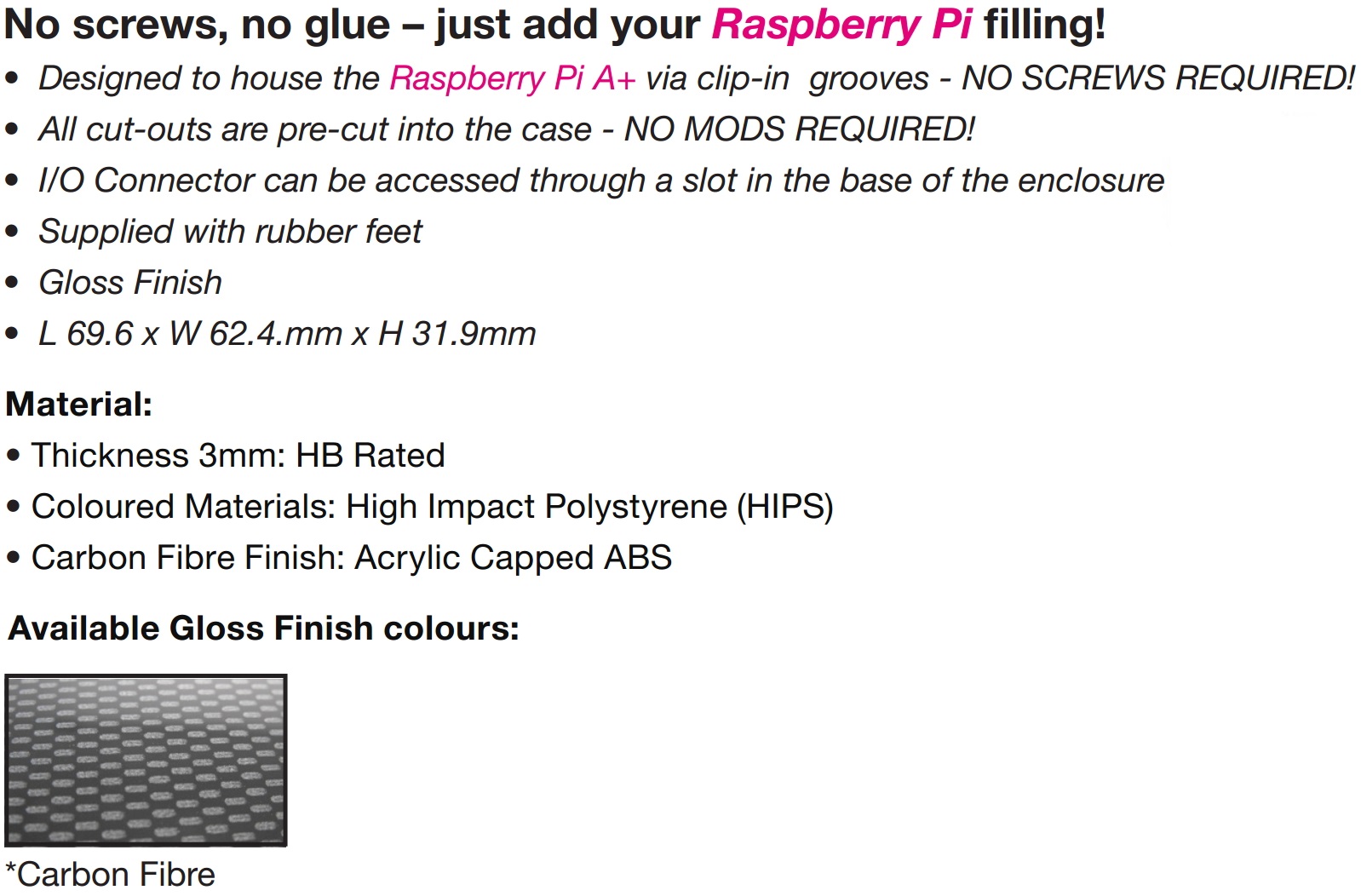 | 8445542 קופסת זיווד קרבון עבור +RASPBERRY PI MODEL A | CAMDENBOSS | קופסת זיווד קרבון עבור +RASPBERRY PI MODEL A ♦ ללא צורך בברגים♦ מסופקת עם רגליות גו... מוצרי פיתוח לאלקטרוניקה » מוצרי פיתוח לאלקטרוניקה - RASPBERRY PI | כמות |
