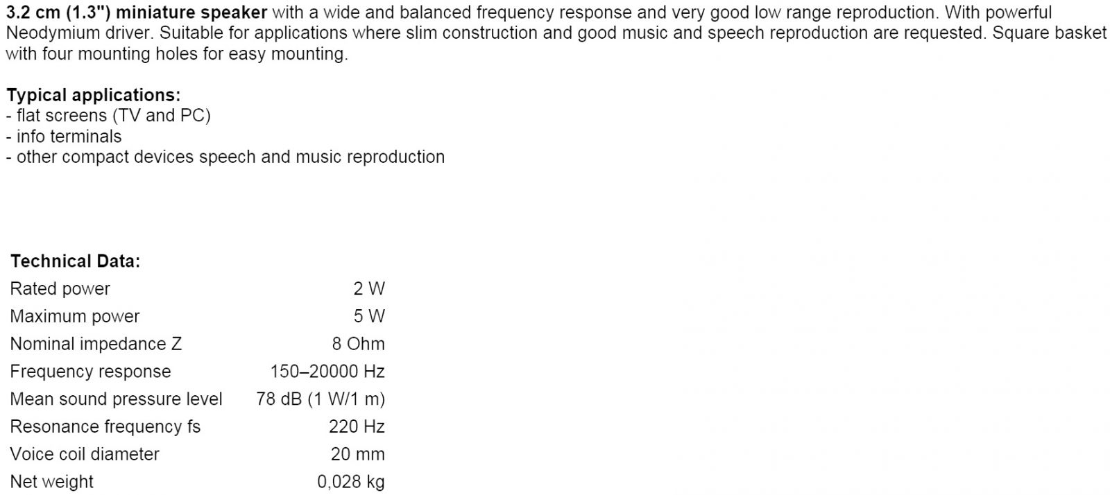 | 5617532 מיני רמקול - ''1.3 - FULL RANGE - 8OHM - 2W | VISATON | מיני רמקול - ''1.3 - FULL RANGE - 8OHM - 2W ♦ טווח תדרים : 150-20000HZ &nbs... רכיבי אלקטרוניקה » זמזמים , סירנות ורמקולים | כמות |