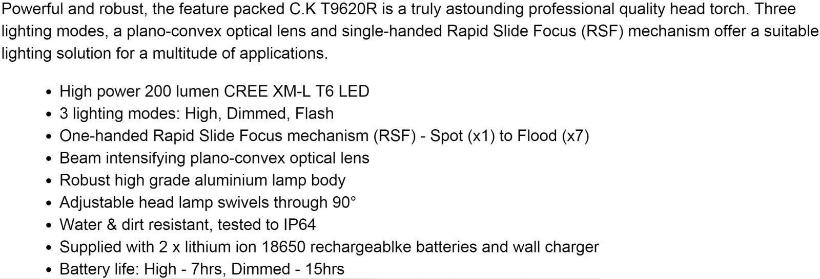 | 5090092 פנס ראש מקצועי נטען - CK TOOLS T9621R - 200 LUMENS | CK TOOLS | פנס ראש מקצועי נטען - CK TOOLS T9621R - 200 LUMENS ♦ עוצמת הארה : 200 לומנס♦ רמת אטימות... נורות , פנסים ומוצרי תאורה » פנסים | לא ניתן להזמין - אזל המלאי |