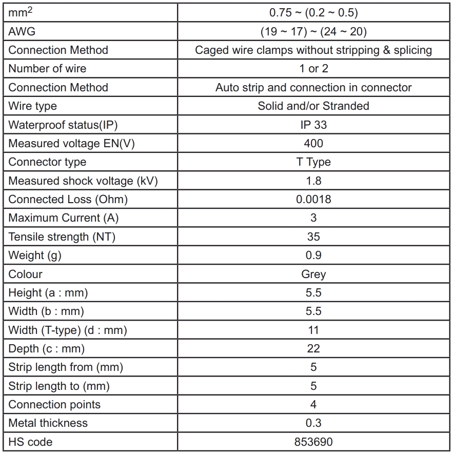 מחבר לחיבור חוטים - T-TYPE - 0.5MM° ~ 0.75MM²