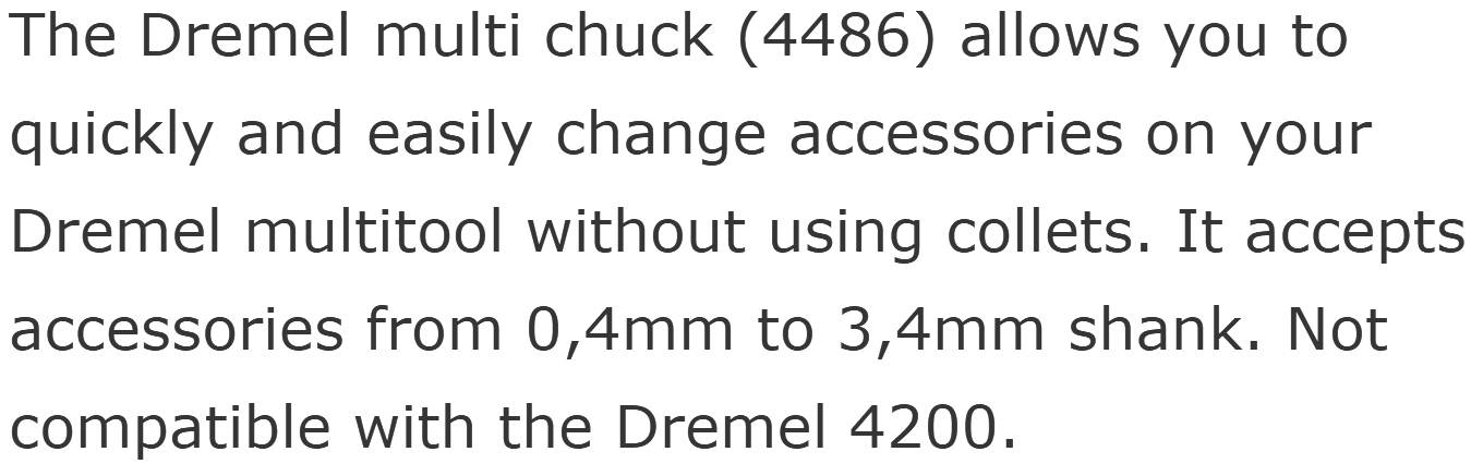 | 2762242 תפסן אביזרים למשחזת ציר - DREMEL MULTI CHUCK 4486 | DREMEL | תפסן אביזרים למשחזת ציר - DREMEL MULTI CHUCK 4486 ♦ מתאים לאביזרים עם ציר בקוטר 0.4MM ~ 3.4MM... כלי עבודה נטענים / חשמליים » משחזות ציר ומולטיטולס | כמות |