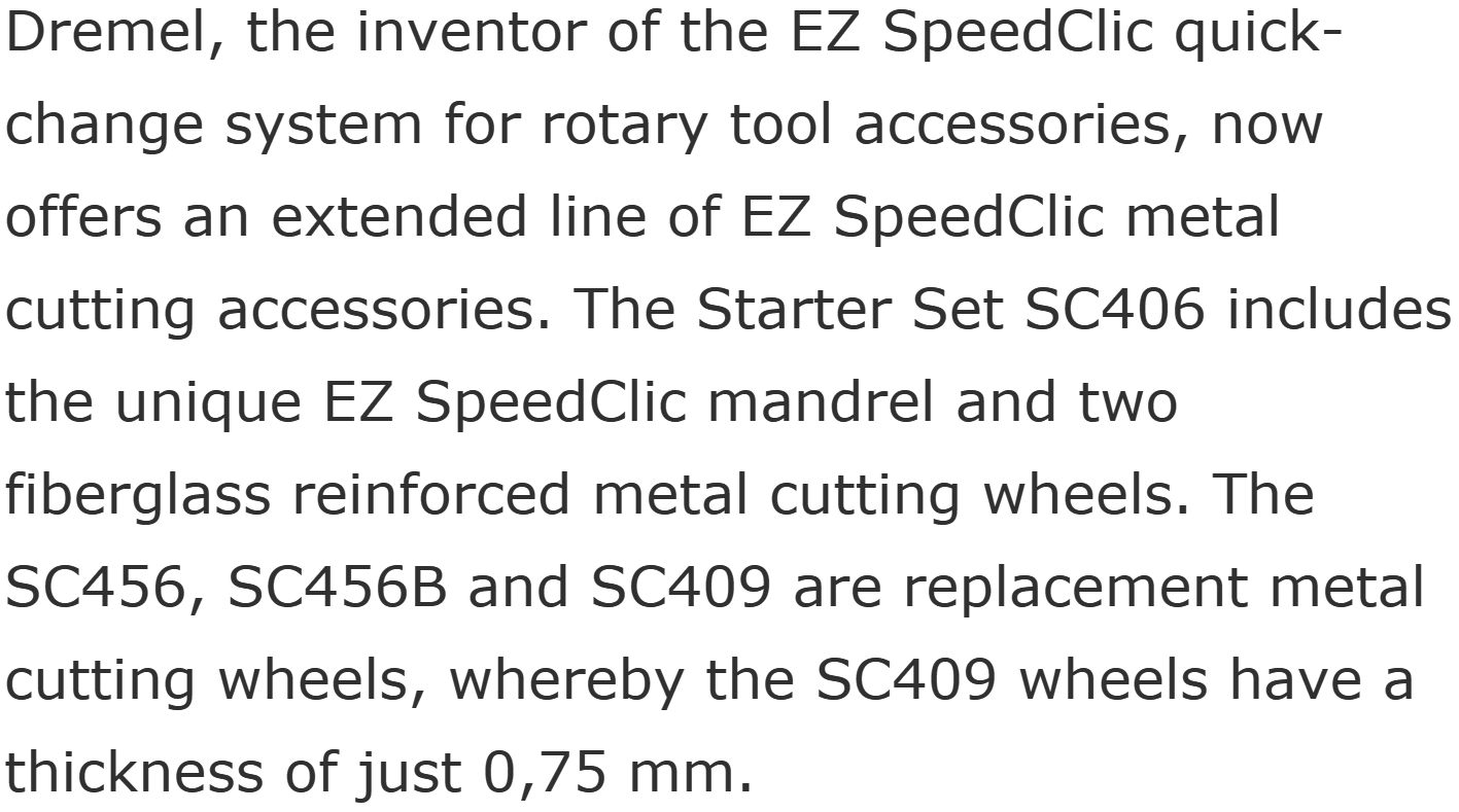 | 9955761 ערכה בסיסית לחיתוך מתכת - DREMEL EZ SPEEDCLIC SC406 | DREMEL | ערכה בסיסית לחיתוך מתכת - DREMEL EZ SPEEDCLIC SC406 ♦ מסופקת עם ציר EZ SPEEDCLIC ושתי דיסקיות ... כלי עבודה נטענים / חשמליים » משחזות ציר ומולטיטולס | כמות |