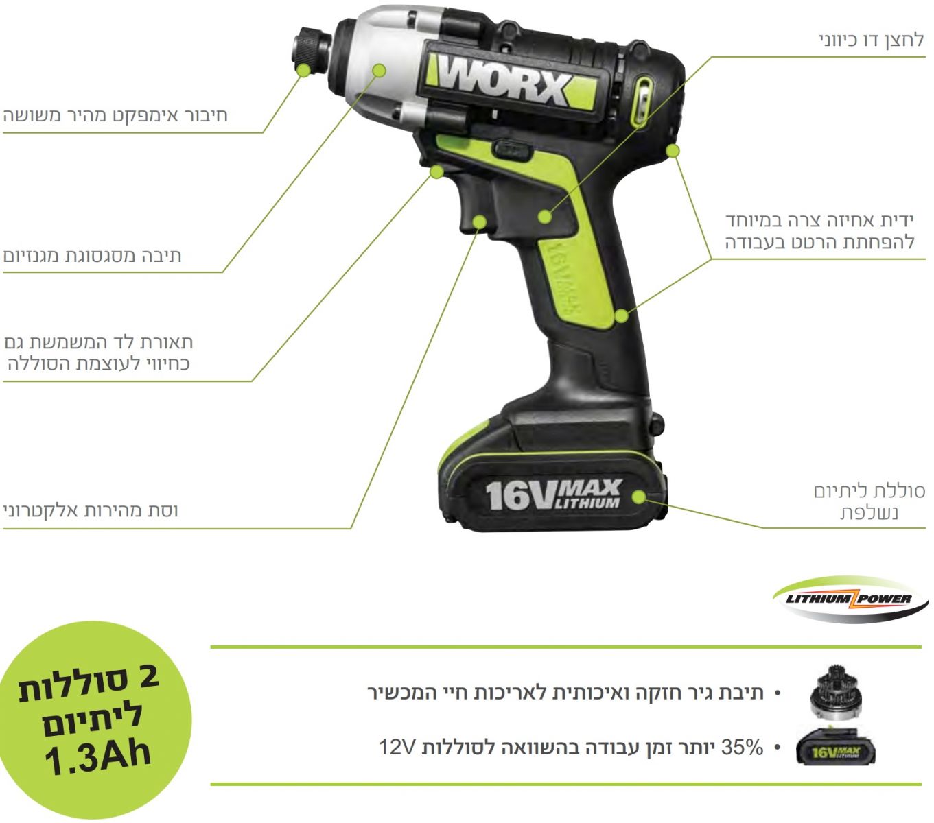 | WU281 מברגת אימפקט מקצועית נטענת WORX WU281 - 16V | WORX PROFESSIONAL | מברגת אימפקט מקצועית נטענת WORX WU280 - 12V ♦ מתח עבודה : 16V♦ מהירות סיבוב : 0-26... כלי עבודה נטענים / חשמליים » מברגות / מקדחות / פטישונים | לא ניתן להזמין - אזל המלאי |