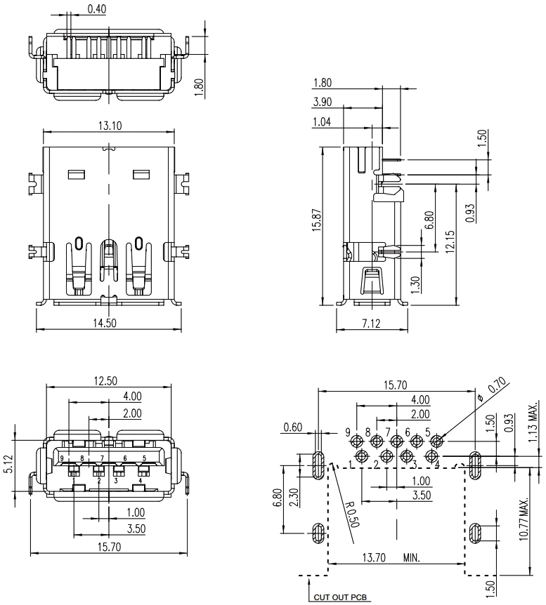 שקע (USB3.0 (A זוויתי למעגל מודפס - OFFSET THT