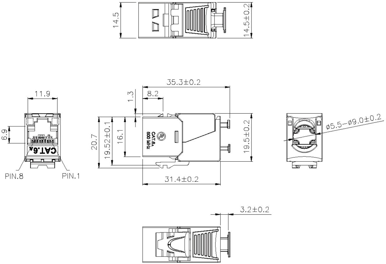 מחבר מסוכך RJ45 8P8C - נקבה לנעיצה לכבל - CAT6A