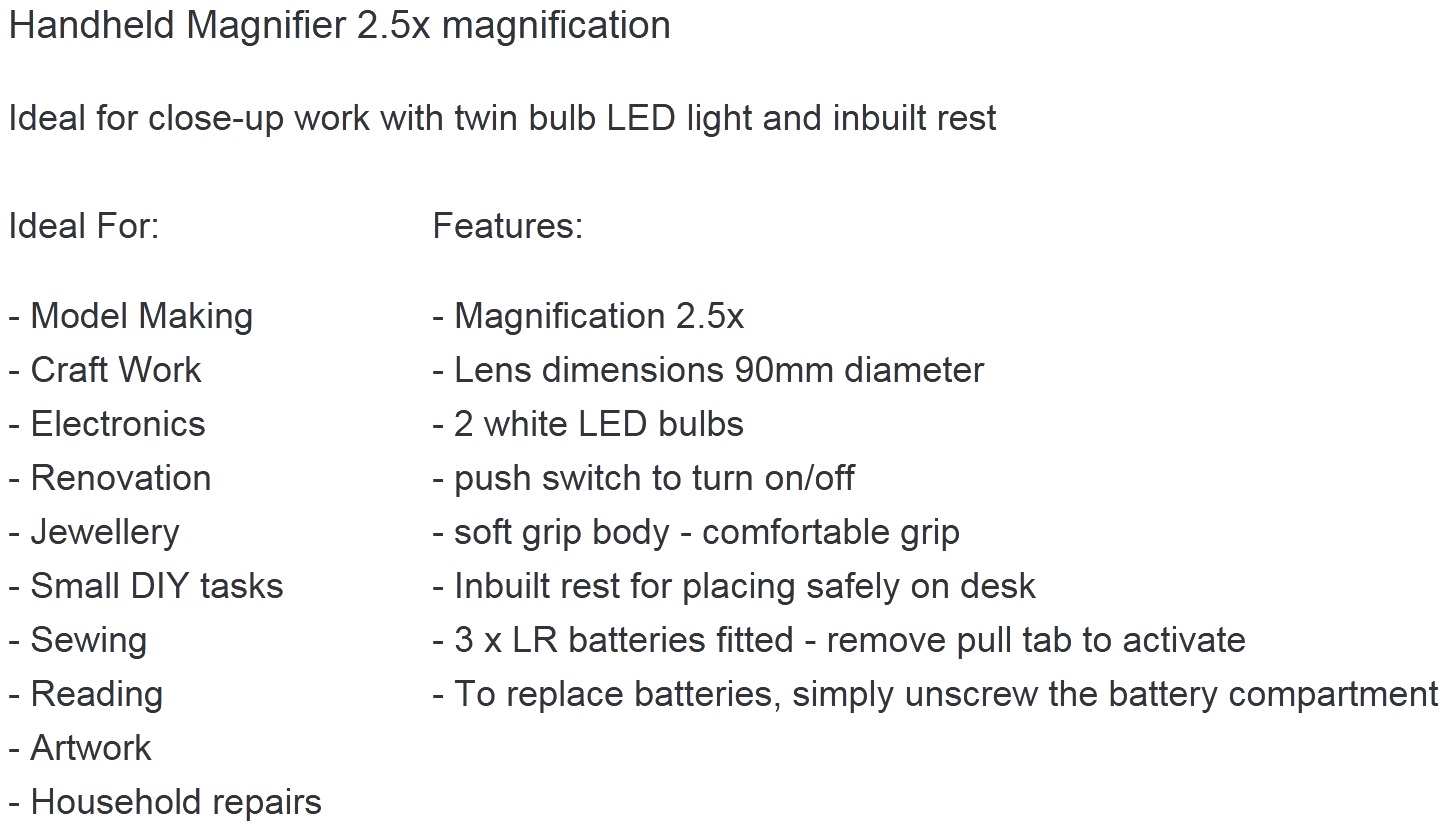 | 4972442 זכוכית מגדלת ידנית עם תאורת LED - הגדלה X2.5 | LIGHTCRAFT | זכוכית מגדלת ידנית עם תאורת LED - הגדלה X2.5 ♦ ידית ארגונומית מגומי מוקשח לנוחות מירבית&d... זכוכיות מגדלת ומיקרוסקופים » זכוכיות מגדלת | כמות |