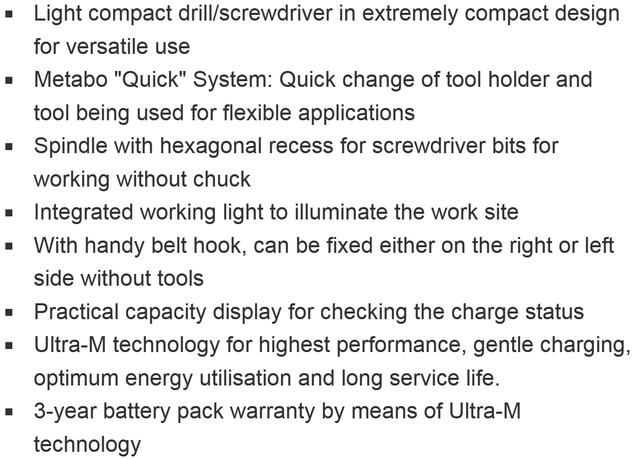 | 6952242 מברגה / מקדחה נטענת METABO POWERMAXX QUICK BASIC - 10.8V | METABO | מברגה / מקדחה נטענת METABO POWERMAXX QUICK BASIC - 10.8V ♦ סוג סוללות : 10.8V Li-ion 2.0AH... כלי עבודה נטענים / חשמליים » מברגות / מקדחות / פטישונים | לא ניתן להזמין - אזל המלאי | |