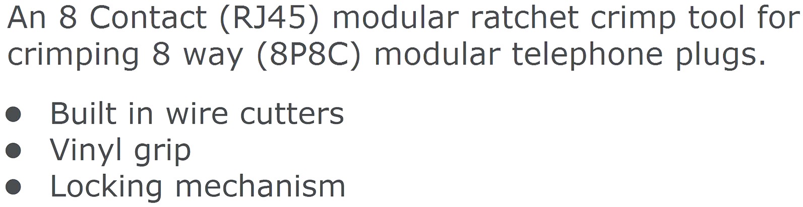 | 0247441 לוחץ למחברי תקשורת - DURATOOL - RJ45 | DURATOOL | לוחץ למחברי תקשורת - DURATOOL - RJ45 ♦ משולב עם קטר לכבלי תקשורת♦ עיצוב ארגונומי לאחיזה נוחה... כלי עבודה ידניים » לוחצים לכבלים | כמות |