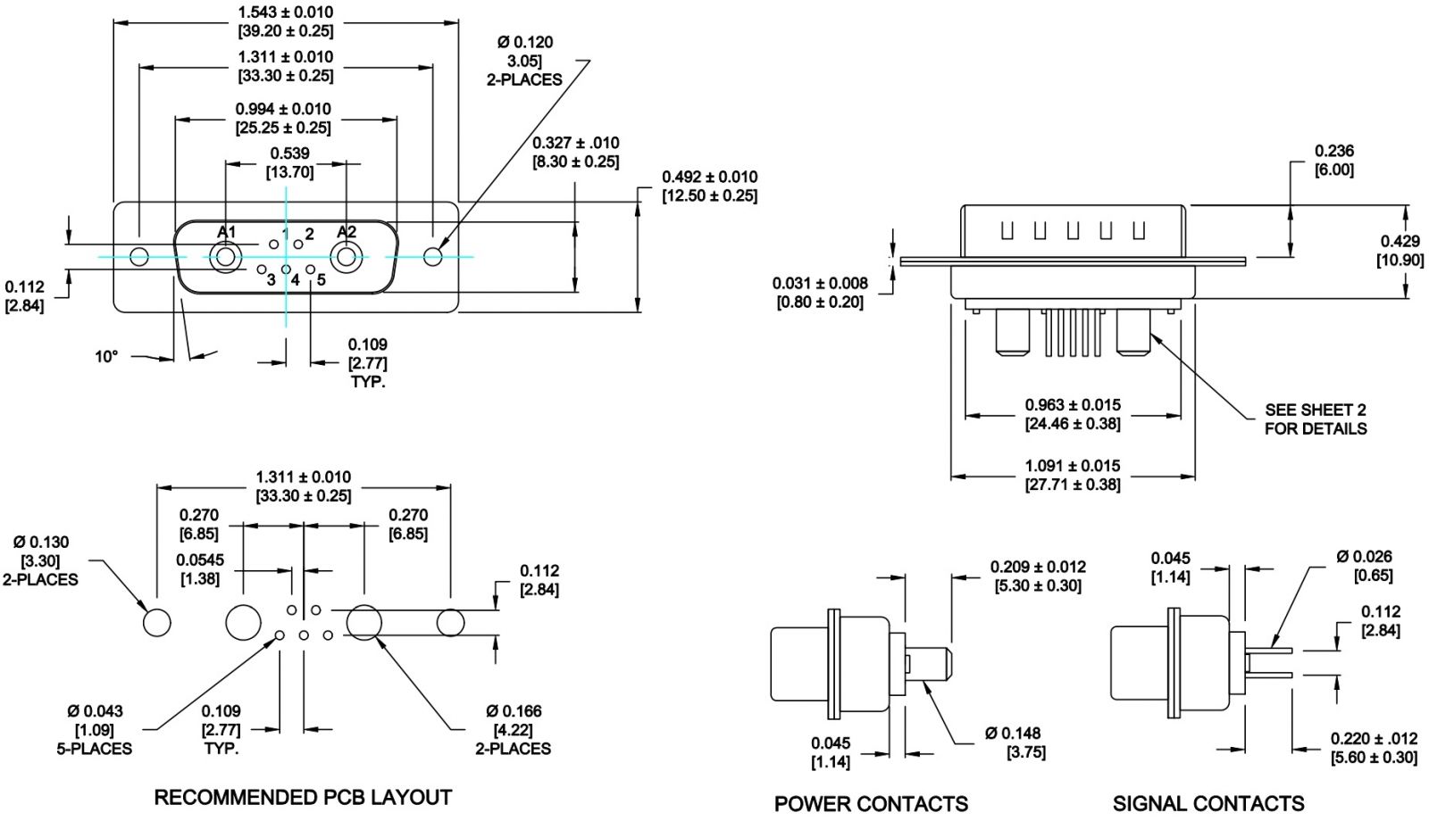 מחבר D-TYPE COMBO IP67 - זכר למעגל מודפס - 40A - DB-7W2