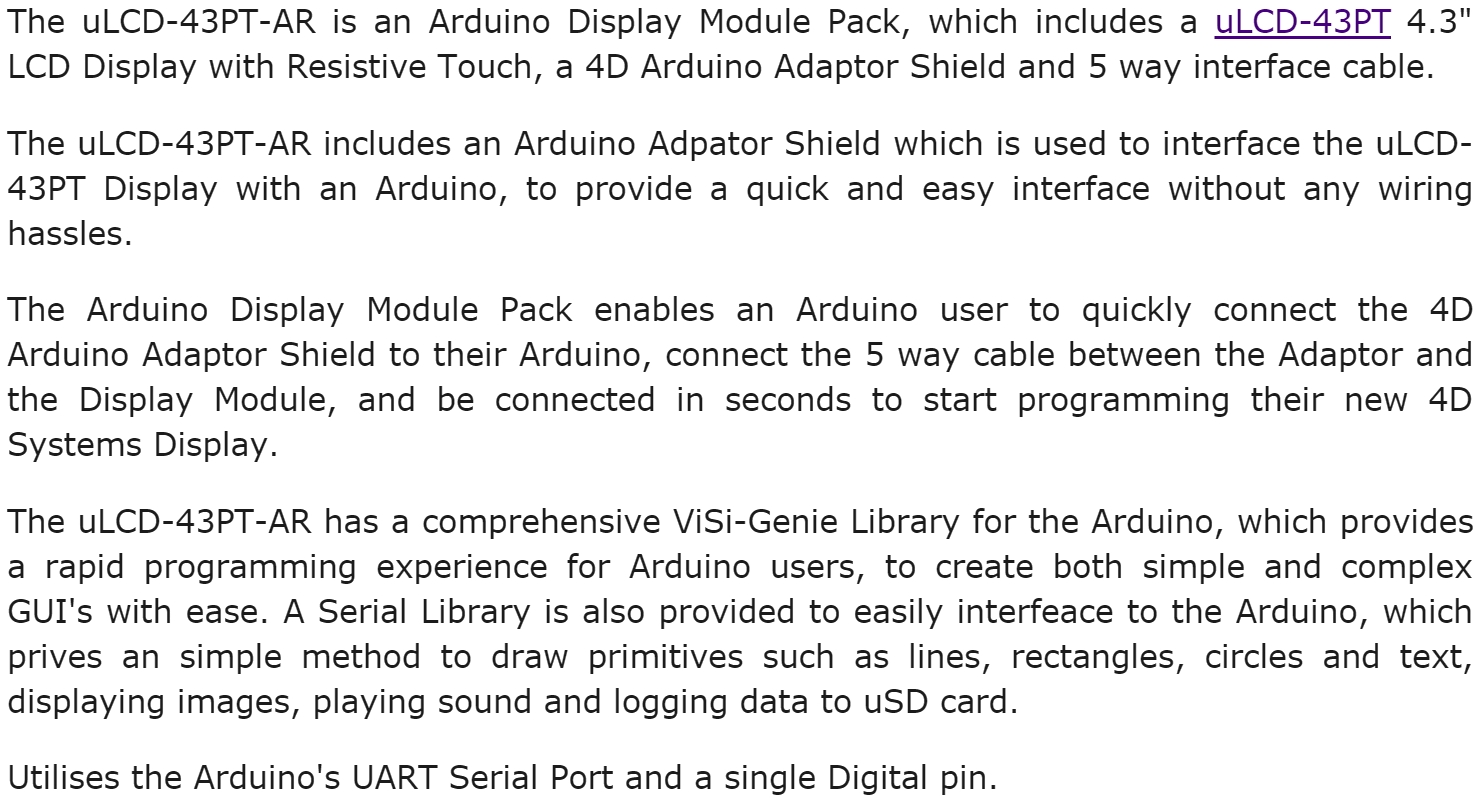 | 7021542 מסך מגע ''4.3 LCD עבור ARDUINO | 4D SYSTEMS | מסך מגע ''4.3 LCD עבור ARDUINO מסופק עם מתאם וכבל התחברות לכרטיס הארדואינו ... מוצרי פיתוח לאלקטרוניקה » מוצרי פיתוח לאלקטרוניקה - ARDUINO | לא ניתן להזמין - אזל המלאי |