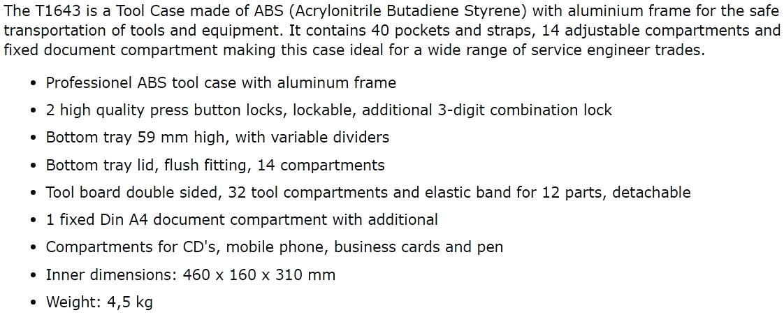 | 2094942 מזוודת אחסון מקצועית לכלי עבודה - CK TOOLS T1643 | CK TOOLS | מזוודת אחסון מקצועית לכלי עבודה - CK TOOLS T1643 ♦ גוף בנוי מפלסטיק ABS קשיח עם מסגרת אלומיניום&di... ארגזי כלים ופתרונות אחסון » ארגזי כלים , מזוודות טכנאים ותיקים לכלי עבודה | כמות |