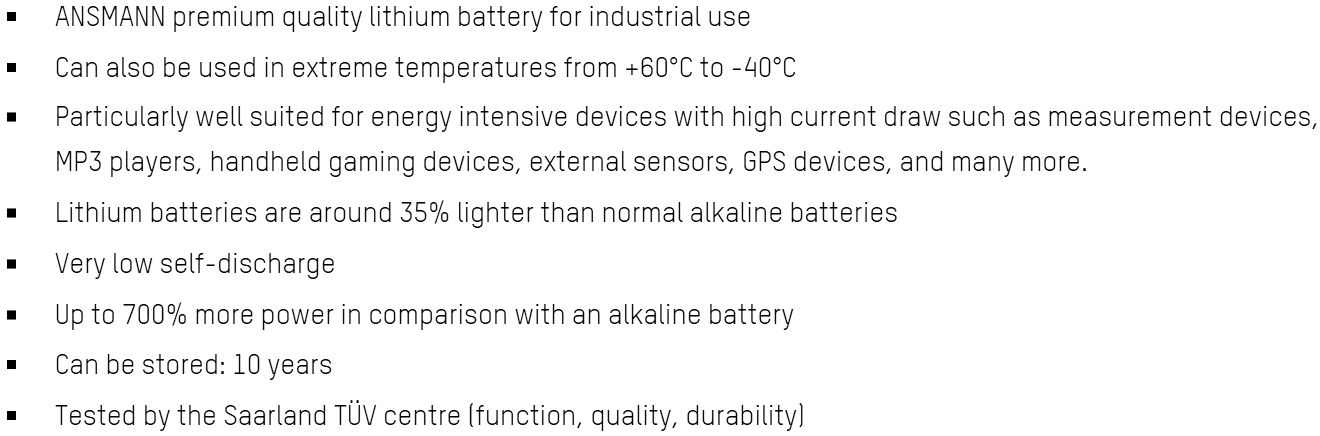 | 8424842 סוללות ליתיום תעשיתיות - AAA 1.5V - מארז 10 יחידות | ANSMANN | סוללות ליתיום תעשיתיות - AAA 1.5V - מארז 10 יחידות ♦ שייכות לסדרת INDUSTRIAL LITHIUM של חברת A... סוללות, מצברים ומטענים » סוללות לא נטענות | כמות | |