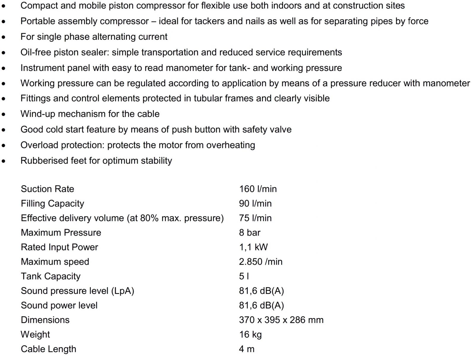 | 0510052 קומפרסור 5 ליטר ללא שמן - METABO POWER 180-5 W OF | METABO | קומפרסור 5 ליטר ללא שמן - METABO POWER 180-5 W OF ♦ הספק : 1100W♦ לחץ מרבי : 8BAR♦&n... כלי עבודה נטענים / חשמליים » קומפרסורים , גנרטורים ואביזרים | כמות |