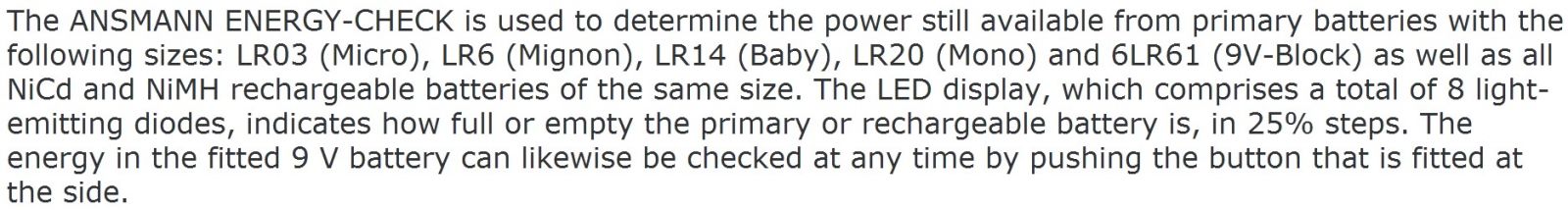 | 3713521 בודק סוללות מקצועי - ANSMANN ENERGY CHECK | ANSMANN | בודק סוללות מקצועי - ANSMANN ENERGY CHECK ♦ מתאים לבדיקת סוללות רגילות וסוללות נטענות AA , AAA... סוללות, מצברים ומטענים » מכשירי בדיקה לסוללות | לא ניתן להזמין - אזל המלאי |
