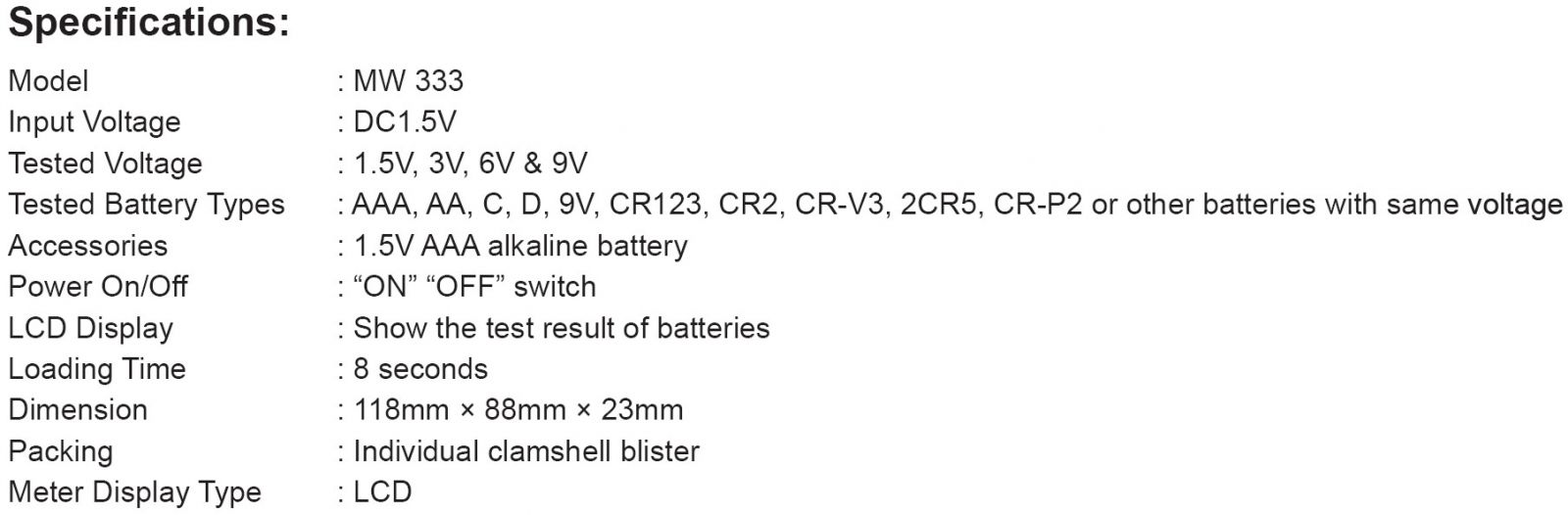 | 92550NI בודק סוללות אוניברסלי - MW333 | MULTICOMP | בודק סוללות אוניברסלי - MW333 ♦ מתאים לבדיקת סוללות רגילות וסוללות נטענות AA , AAA , C , D , 9V... סוללות, מצברים ומטענים » מכשירי בדיקה לסוללות | כמות |