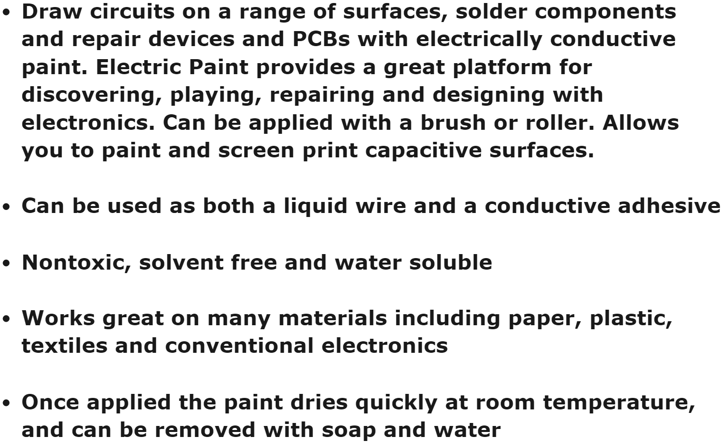 | 5160152 צבע מוליך חשמל - צנצנת 50 מ''ל | BARE CONDUCTIVE | צבע מוליך חשמל - צנצנת 50 מ''ל ♦ אידיאלי לשרטוט ותיקון מעגלים אלקטרוניים♦ יכול ל... מלחמים ותחנות הלחמה » בדיל וחומרי הלחמה לאלקטרוניקה | לא ניתן להזמין - אזל המלאי |