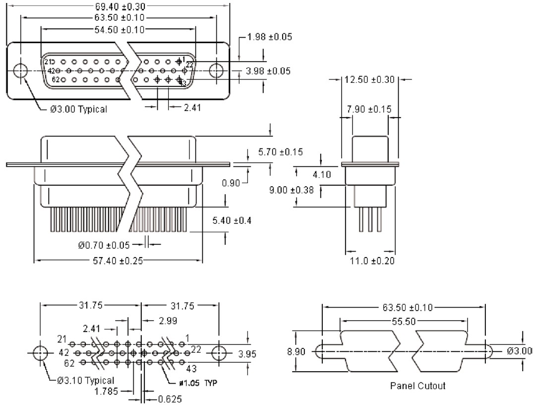 מחבר D-TYPE HIGH DENSITY למעגל מודפס - נקבה 62 מגעים
