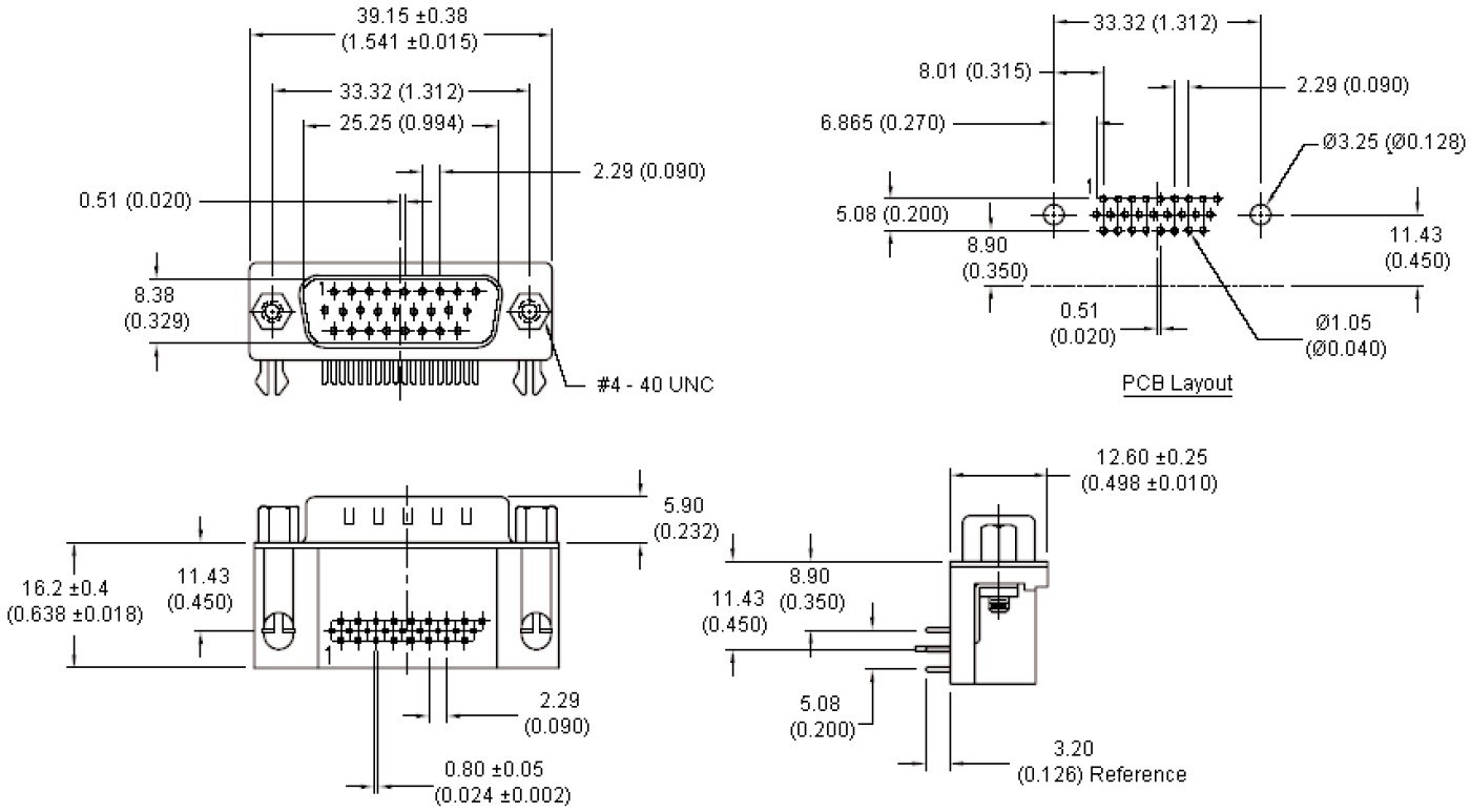 מחבר D-TYPE HIGH DENSITY זוויתי למעגל מודפס - זכר 26 מגעים