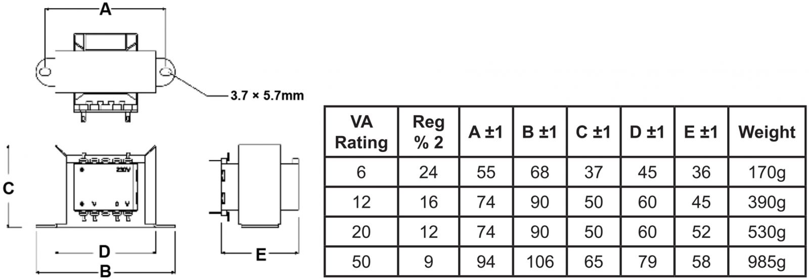 שנאי מבודד לפאנל - CTFCS - 230V ⇒ 2X6V - 500MA / 6VA