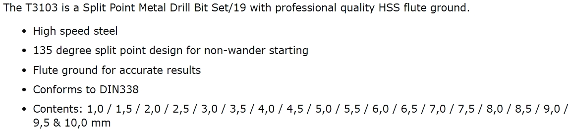 | 2250742 סט מקדחים מקצועי למתכת - 19 יחידות - CK TOOLS T3103 | CK TOOLS | סט מקדחים מקצועי למתכת - 19 יחידות - CK TOOLS T3103 ♦ פלדת HSS איכותית וחזקה♦ שפתיים מדויקות בזוו... כלי עבודה נטענים / חשמליים » מקדחים / ביטים / כרסמים | כמות |