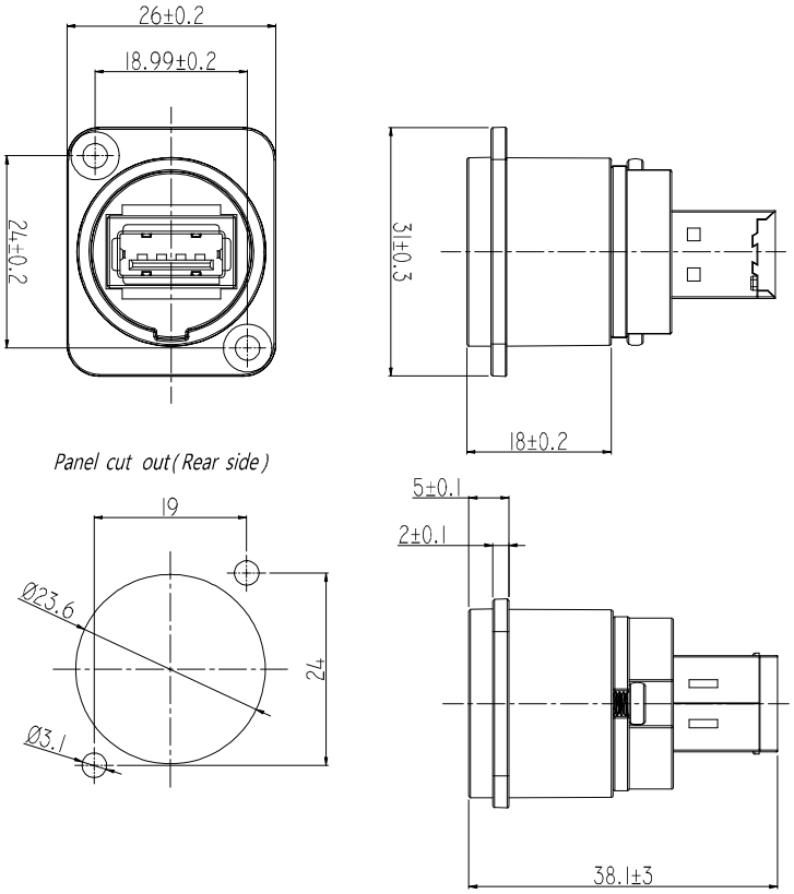 מתאם לפנל - USB 2.0 A (F) ~ USB 2.0 B (F) - CSK HOLES