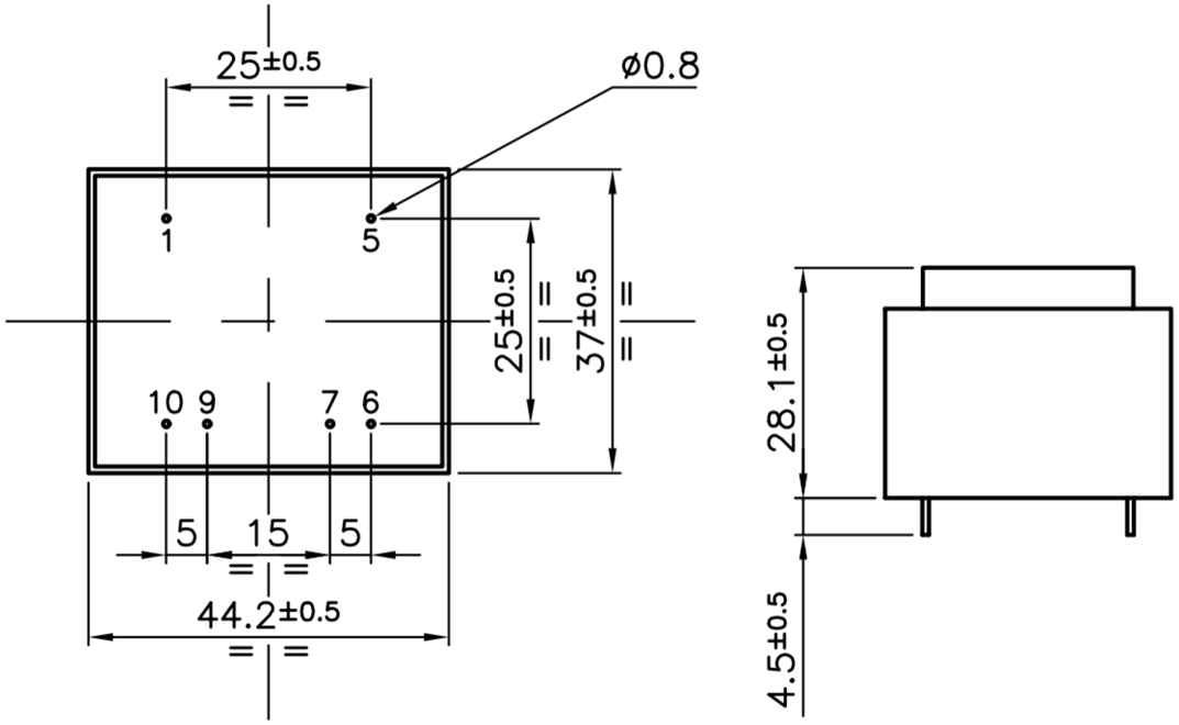 שנאי יצוק למעגל מודפס - 230V ⇒ 2X15V - 167MA / 5VA