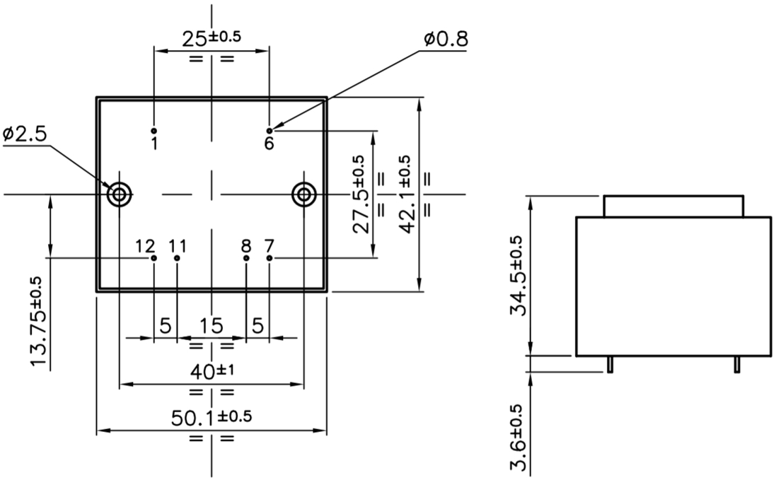 שנאי יצוק למעגל מודפס - 230V ⇒ 2X9V - 556MA / 10VA