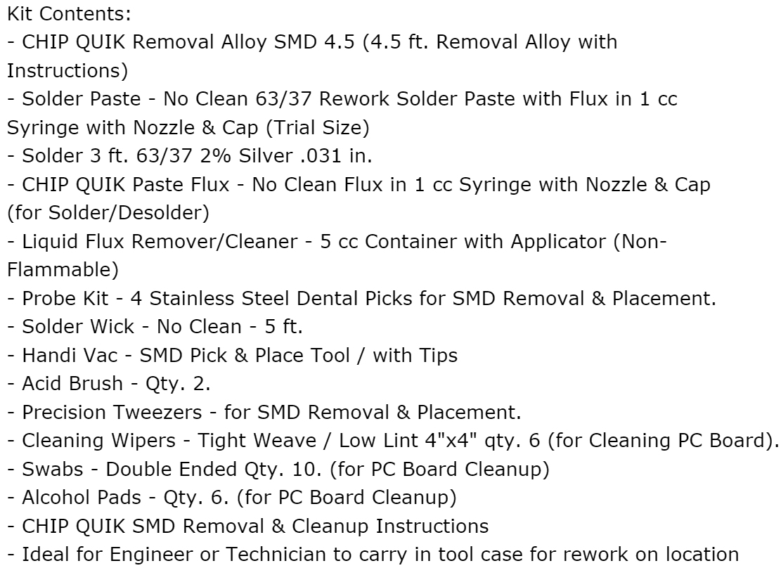 | 7220581 ערכה מקצועית להלחמה ולהסרת רכיבי SMD2000 - SMD | CHIP QUIK | ערכה מקצועית להלחמה ולהסרת רכיבי SMD2000 - SMD &... מלחמים ותחנות הלחמה » בדיל וחומרי הלחמה לאלקטרוניקה | כמות |