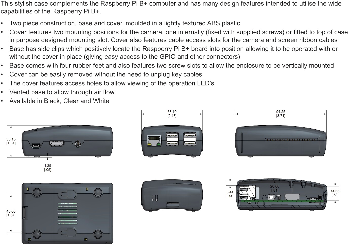 | 2014252 קופסת זיווד שחורה עבור RASPBERRY PI 3 | CAMDENBOSS | קופסת זיווד שחורה עבור RASPBERRY PI 3 ♦ מבנה חזק ועמיד HIGH IMPACT ABS♦ לוגו R... מוצרי פיתוח לאלקטרוניקה » מוצרי פיתוח לאלקטרוניקה - RASPBERRY PI | כמות | |