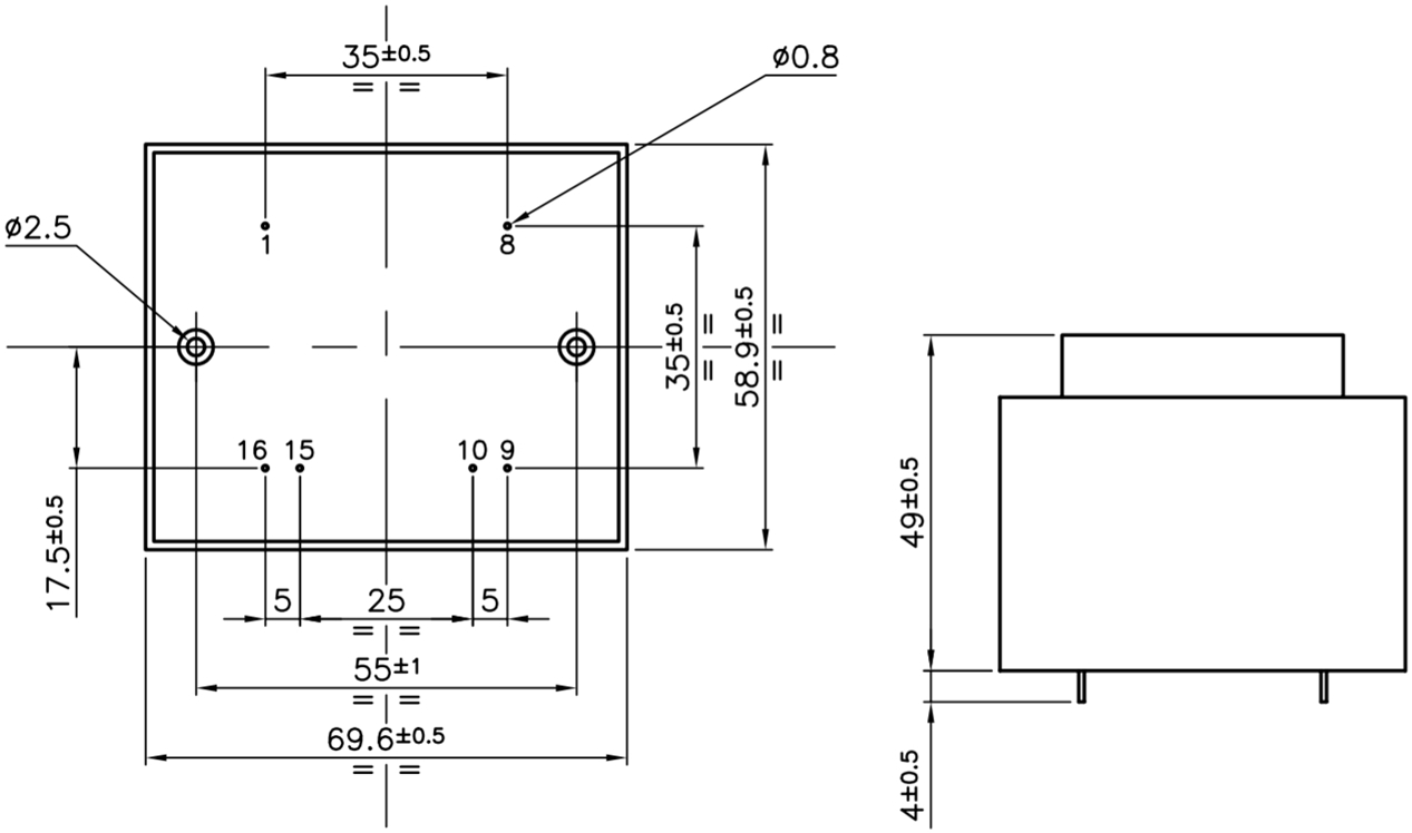 שנאי יצוק למעגל מודפס - 230V ⇒ 2X15V - 1000MA / 30VA