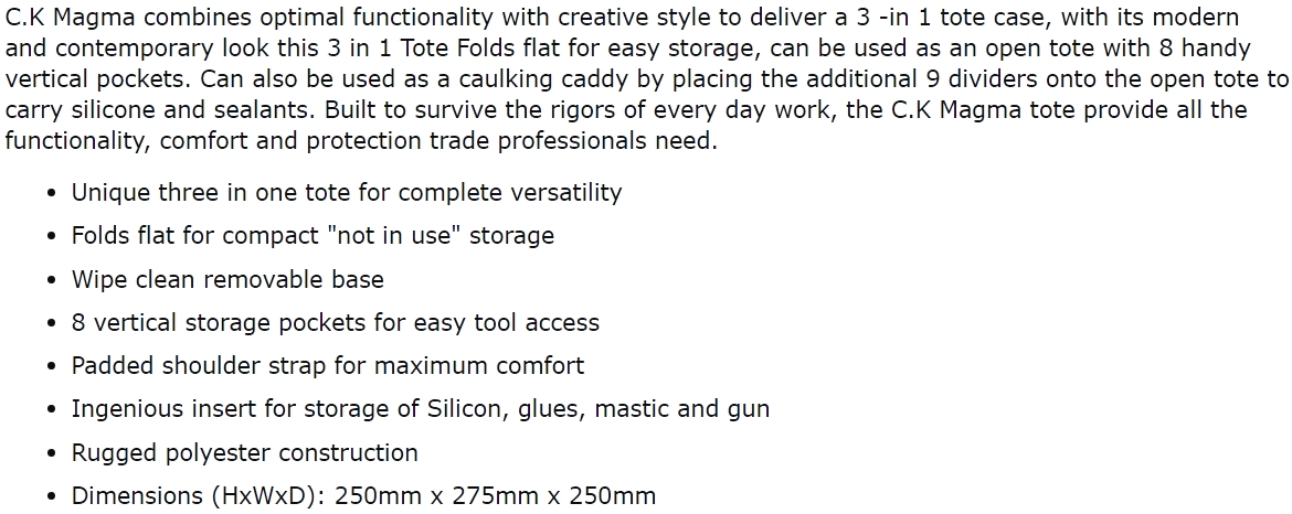 | 4159252 תיק נשיאה לכלי עבודה - CK MAGMA MA2637 - 275X550X250MM | CK MAGMA | תיק נשיאה לכלי עבודה - CK MAGMA MA2637 - 275X550X250MM ♦ עשוי מבד פוליאסטר חזק ועמיד&diam... ארגזי כלים ופתרונות אחסון » ארגזי כלים , מזוודות טכנאים ותיקים לכלי עבודה | לא ניתן להזמין - אזל המלאי |