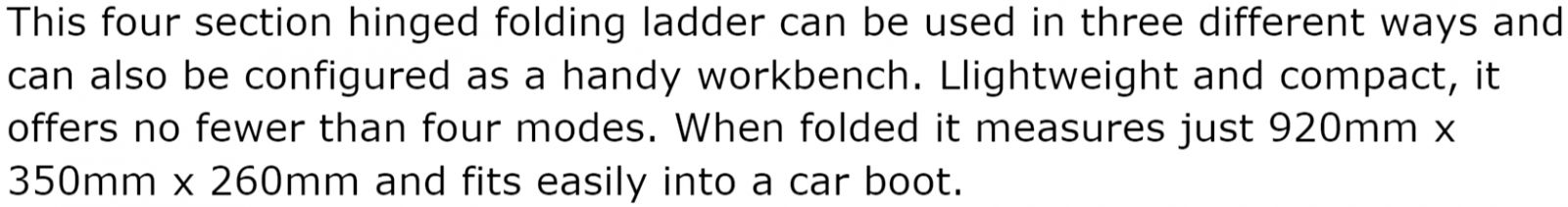 | 5003452 סולם אלומיניום מקצועי עם ארבעה מפרקים - 3.60 מטר | YOUNGMAN | סולם אלומיניום מקצועי עם ארבעה מפרקים - 3.60 מטר ♦ מאושר בתקן בטיחות BS EN131 GS TUV♦ מבנה אלומינ... ארגזי כלים ופתרונות אחסון » שולחנות עבודה , ארונות מדפים וסולמות | לא ניתן להזמין - אזל המלאי |