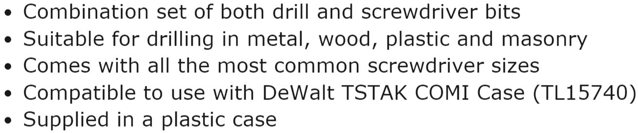 | 5309252 סט ביטים ומקדחים מקצועי - 100 יחידות - DEWALT DT71569-QZ | DEWALT | סט ביטים ומקדחים מקצועי - 100 יחידות - DEWALT DT71569-QZ ♦ ביטים מפלדה חזקה ואיכותית♦ כולל מוביל ... כלי עבודה נטענים / חשמליים » מקדחים / ביטים / כרסמים | כמות |