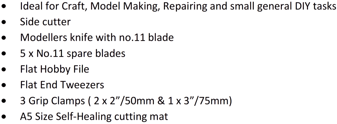 | 4672542 סט כלים מושלם עם משטח חיתוך - (MC PTK1015 - A5 (230X160MM | MODELCRAFT | סט כלים מושלם עם משטח חיתוך - (MODELCRAFT PTK1015 - A5 (230X160MM ♦ משטח חיתוך SELF HEALING PVC♦ ... כלי עבודה ידניים » סכינים , מספריים וכלי חיתוך | כמות |