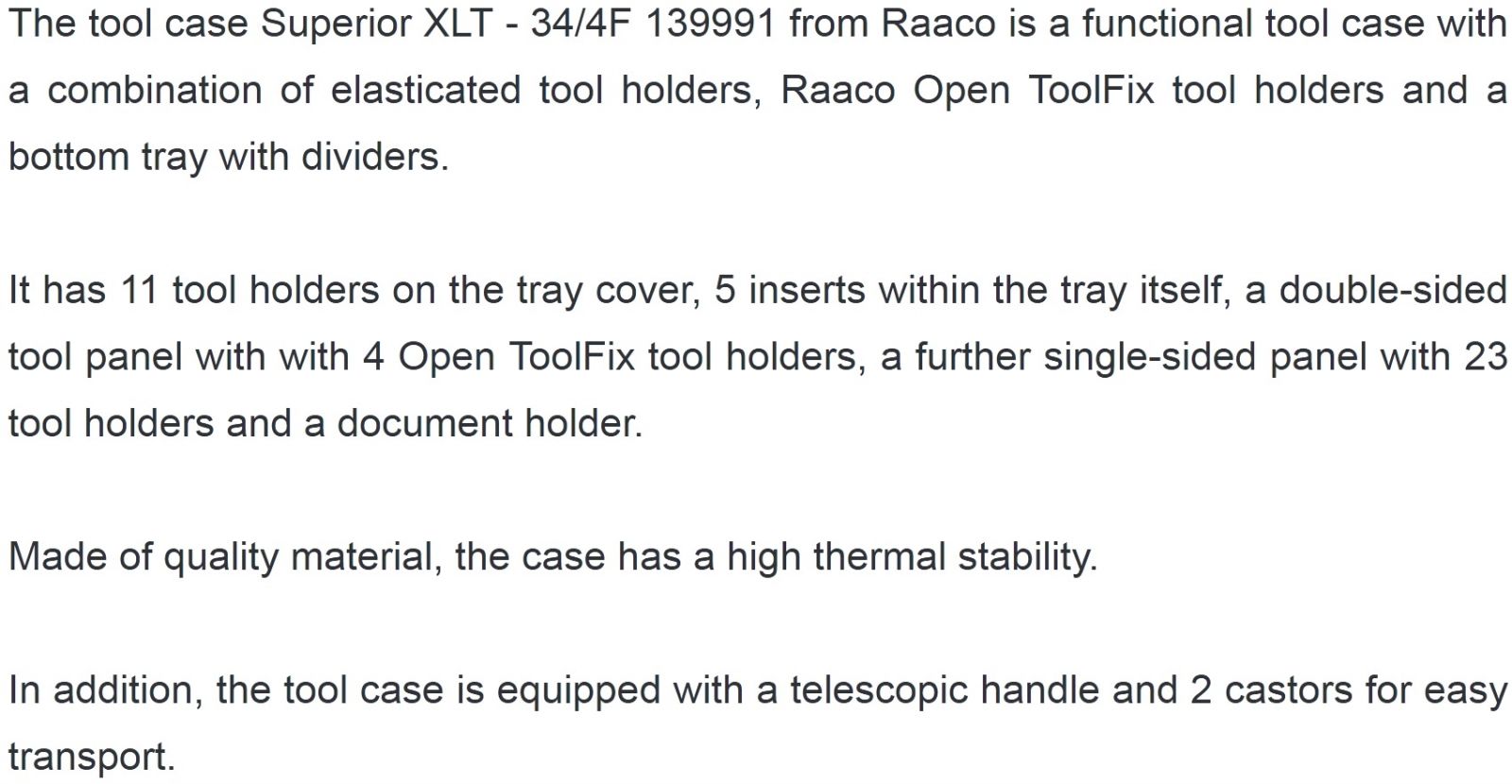 | 9251132 מזוודת טרולי לכלי עבודה - RAACO TOOLCASE SUPERIOR XLT | RAACO | מזוודת טרולי לכלי עבודה - RAACO TOOLCASE SUPERIOR XLT ♦ גוף ABS קשיח להגנה מירבית על כלי העבודה&di... ארגזי כלים ופתרונות אחסון » ארגזי כלים , מזוודות טכנאים ותיקים לכלי עבודה | לא ניתן להזמין - אזל המלאי |