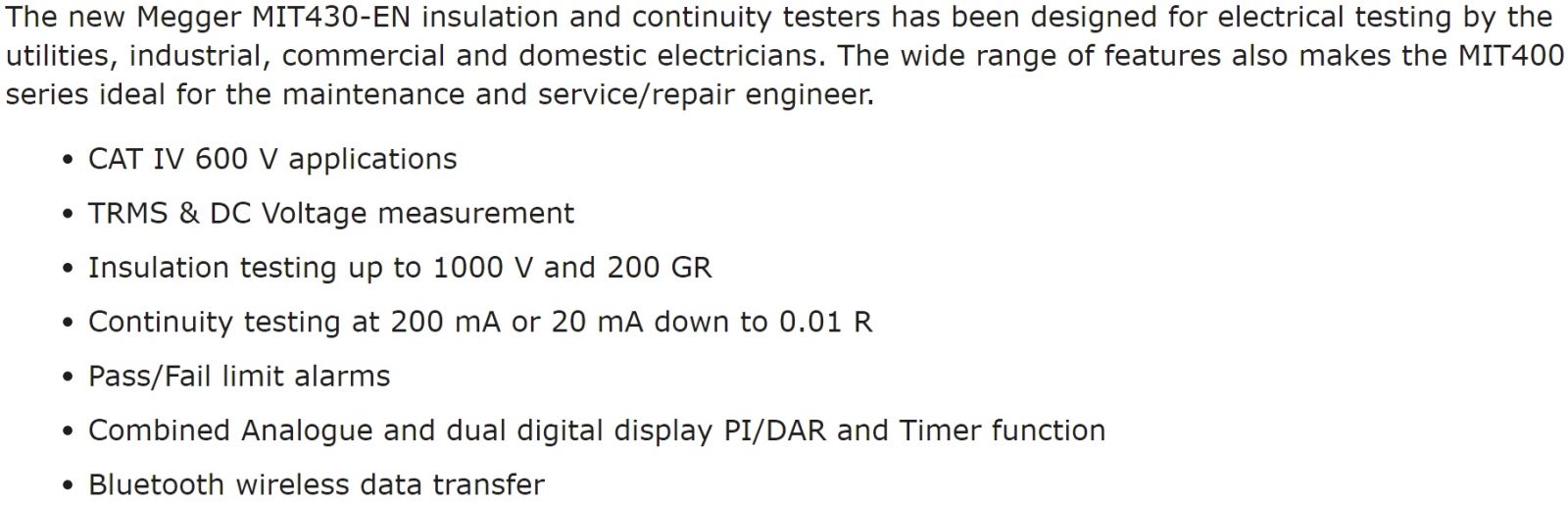 | 5226801 מודד בידוד / התנגדות / רציפות דיגיטלי - MEGGER MIT430 - 50V ~ 1000V | MEGGER | מודד בידוד / התנגדות / רציפות דיגיטלי - MEGGER MIT430 - 50V ~ 1000V ♦ תצוגת LCD דיגיטלית מוארת גדול... ציוד בדיקה ומכשירי מדידה » ציוד בדיקה לחשמלאים | לא ניתן להזמין - אזל המלאי |