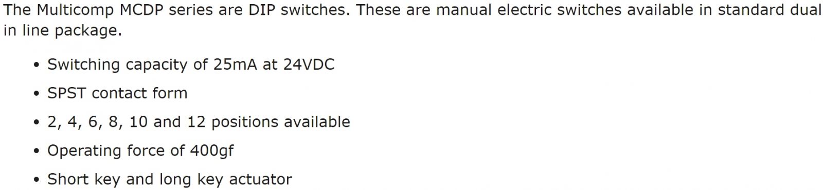 | 8161749 מפסק DIP למעגל מודפס - 6 מעגלים - סדרת DP | MULTICOMP | מפסק DIP למעגל מודפס - 6 מעגלים - סדרת DP ♦ סוג המפסק : DIP SWITCH SPST THROUGH HOLE &nbs... רכיבי אלקטרוניקה » מפסקים לאלקטרוניקה | כמות | |