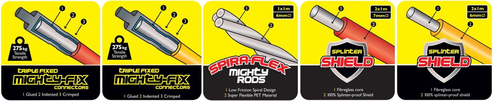 ♦ מוטות בקוטר 4 מ''מ , 6 מ''מ ו 7 מ''מ עם ציפוי פיברגלס בעל גמישות מותאמת