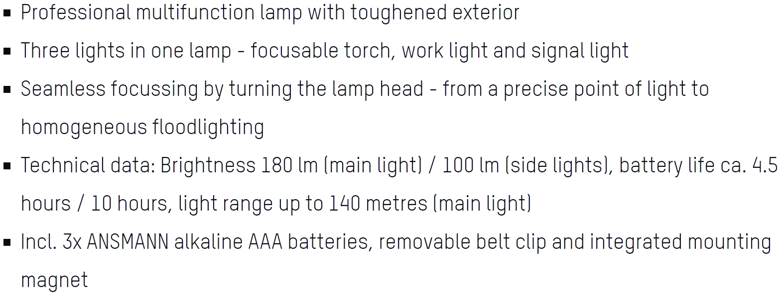 | 1686272 פנס ידני מקצועי - ANSMANN FUTURE MULTI 3IN1 - 180 LUMENS | ANSMANN | פנס ידני מקצועי - ANSMANN FUTURE MULTI 3IN1 - 180 LUMENS ♦ סוג תאורה : 3W CREE LED♦ מרח... נורות , פנסים ומוצרי תאורה » פנסים | כמות |